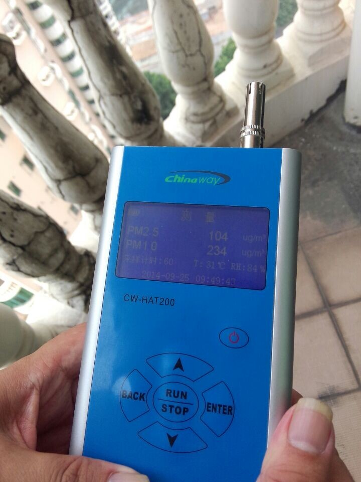 上圖為早上9點50分實測室外pm2.5,pm10的數據,從檢測儀上的數據可以看到,PM2.5的濃度已經達到104,PM10的濃度已經達到234.今天是9月份深圳空氣質量目前為止最差的一天。